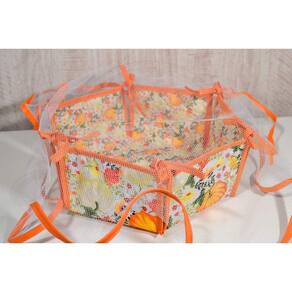 Cesta dupla face fabricado em tecido matelado e estampado, com estampa de abóboras e flores, com fundo branco e com tons de laranja, amarelo e verde, sendo de um lado com estampas maiores e do outro lado estampas menores, detalhes em viés laranja, tule na cor branco com acabamento em viés laranja.