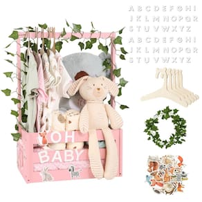 - Faça você mesmo com sua imaginação: preparamos alfabetos, cabides e videiras para sua personalização. Economizando o incômodo de comprar esses acessórios. 2 conjuntos de alfabetos podem ser colados para soletrar o nome do bebê. Pendure roupas adoráveis de bebê na haste de mão, decore a cesta de presente com videiras e pinte a caixa de madeira para combinar com os temas da festa. Esta cesta de bebê está cheia de possibilidades para sua criação encher todos os itens que você quiser.