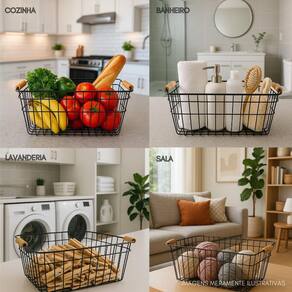 Organize seus ambientes com muito mais charme e praticidade A Cesta de Metal Aramado com Alças de Madeira é perfeita para quem busca funcionalidade sem abrir mão do design moderno. Seja na cozinha, no banheiro, na lavanderia ou até mesmo na sala, ela se adapta a diferentes usos: guardar frutas, organizar toalhas, armazenar produtos de limpeza, rolos de papel higiênico ou até itens de decoração. Seu design clean e minimalista, aliado às alças de madeira que dão um toque aconchegante, transforma a organização em parte da decoração. Uma peça versátil que une resistência, elegância e praticidade para deixar seu dia a dia muito mais fácil Descrição Técnica Produto: Cesta Organizadora Aramada com Alças de Madeira Material: Metal resistente com acabamento de alta durabilidade Medidas: 31 cm comprimento x 20 cm largura x 11,5 cm altura Detalhes: Alças em madeira natural que facilitam o manuseio Utilização Recomendada: Organização de frutas, mantas, utensílios de cozinha, lavanderia, banheiro e decoração em geral Diferenciais: Design versátil, moderno e funcional Ideal para quem busca unir organização e estilo em qualquer ambiente da casa Imagens ilustrativas.