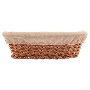 A cesta, feita em plástico que imita o rattan na cor marrom, oferece durabilidade e um visual rústico, enquanto o forro interno em tecido na cor bege confere um toque campestre e pode ser removido para facilitar a limpeza, combinando funcionalidade com uma estética elegante e natural.