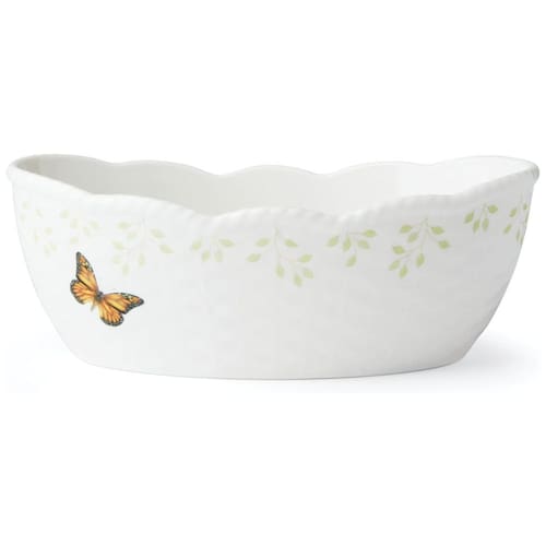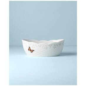 Adicione um toque encantador e elegante à sua mesa com a Cesta de Pão Lenox Butterfly Meadow. Esta peça apresenta delicados motivos florais e um alegre conjunto de borboletas, que trazem um toque de frescor e natureza para suas refeições. Com bordas finamente recortadas, seu design combina beleza e funcionalidade, perfeito para servir pães quentinhos diretamente do forno.
