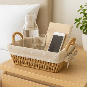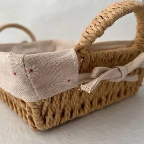 Feitas com material de alta qualidade, incluindo metal na sua estrutura, fibra natural trançada e um forro 100% algodão estampado, elas são tão elegantes quanto versáteis. A estrutura de metal oferece durabilidade e resistência, enquanto a fibra natural proporciona um visual leve e arejado. O forro da bandeja proporciona uma superfície macia e charmosa para suas apresentações e pode ser retirado para higienização.