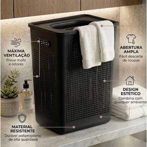 A abertura superior torna o uso mais prático, podendo depositar peças de roupas sem levantar a tampa, mantendo o ambiente sempre em ordem.