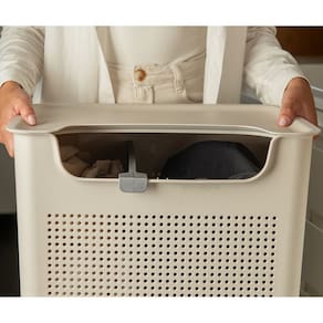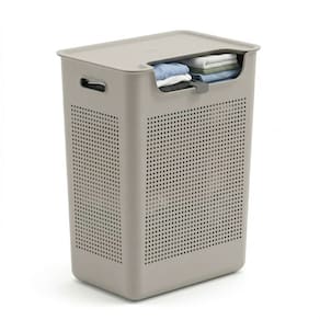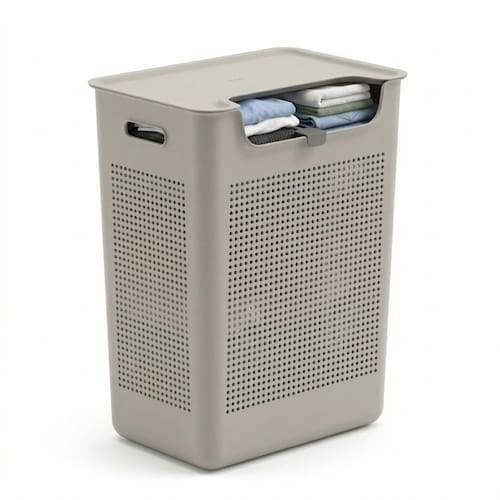 A abertura frontal permite inserir peças pequenas sem esforço, mantendo a tampa basculante fechada e o ambiente sempre em ordem. Com design robusto (30x42x55cm) se adapta bem à lavanderia, closet ou banheiro. Funcional, versátil e pensado para otimizar o seu dia.