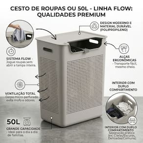 Cesto de Roupa Com Tampa Plástico 50 Litros Duplo Compartimento Flow