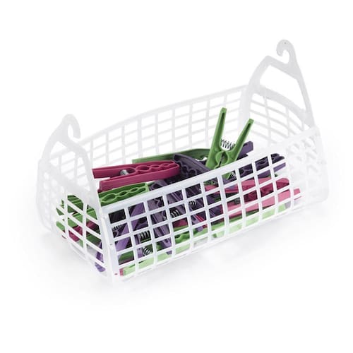 Cesto Emborrachado Alça com 24 Pregadores Grandes Keita Super leve e com alças, o Cesto de Prendedores Keita pode ser fechado, em formato de bolsa, para que você não perca nenhum pregador e, quando aberto, pode ser pendurado no varal, pois possui ganchos. Acompanha 24 prendedores de roupa com cores diversas. Características:Cesto de Pregador de Roupas com 24 Pregadores Grandes;Material: Polietileno de alta qualidade;Cor: branco (cesto) diversas (prendedores);Itens: 1 (um) cesto; 24 (vinte e quatro) pregadores. Dimensões Aproximadas:Largura: 14cm;Comprimento: 23cm;Altura: 14cm;Peso: 190g.