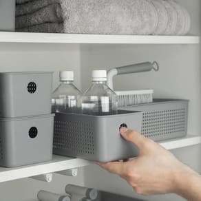 Os cestos possuem diversos tamanhos, são empilháveis e versáteis. São diversas opções com cores neutras e acabamento fosco, que combinam com qualquer ambiente. Podem ser utilizados em closets, cozinhas, lavanderias ou até mesmo na sala de estar para decorar. Características: