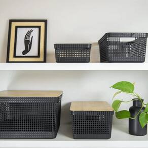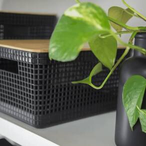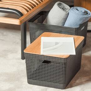 O Cesto Organizador Grid Com Tampa De Bambu possui medidas de (39cm-profundidade x 29cm-largura x 22,6cm-altura)