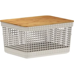 O Cesto Organizador Grid Com Tamp De Bambu possui medidas de 29cm-profundidade x 23cm-largura x 15,6cm-altura Capacidade de 8 litros.Além de possuir tampa em bambu que traz um toque a mais de sofisticação e elegância para qualquer ambiente da sua casa.Cor Bege SUSTENTABILIDADEProduzido de plástico 100% pós-consumo, proveniente de resíduos coletados do litoral brasileiro, com o objetivo de evitar que esse plástico chegue ao mar ou rios da região.DesignDesign minimalista, cores neutras, acabamento fosco, três elementos essenciais para a sofisticação. Diferentes TamanhosA linha traz diferentes tamanhos em seus produtos, adequando-se as necessidades de organização durante o dia a dia. Conteúdo da Embalagem1 cesto com tampa Especificações Técnicas: Altura15.6cmLargura23cmProfundidade29cmPeso668g
