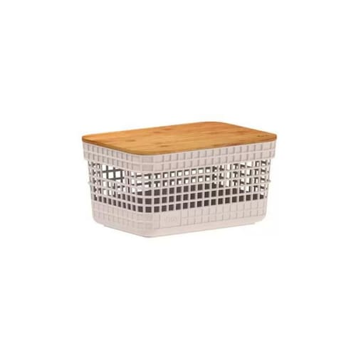 Cesto Organizador Grid Com Tampa Em Bambu 2,5L Ou Bege - Características Gerais do Produto: • Dimensões: 20,3x14,3x10,5cm • Capacidade: 2,5L • Material Principal: Plástico • Linha: Grid • Informações Adicionais: Sugere-se higienizar com sabão neutro e esponja macia, evitando produtos abrasivos no processo de limpeza;