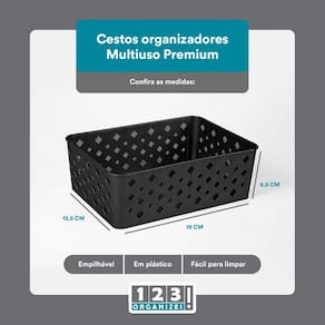 Fabricado em plástico resistente na cor preta, esse cesto é durável e fácil de limpar. Além disso, o design premium da marca 123Organizei garante qualidade e sofisticação ao produto.