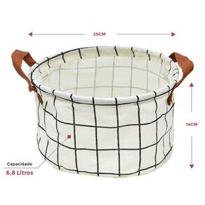 - Medidas: 25 x 14 diâmetro x altura - Alças laterais para puxar de couro sintético - Resistente a água e poeira - Dobrável - Ideal para organizar pequenos objetos, toalhas de rosto, meias e etc... Ean: 789976669359