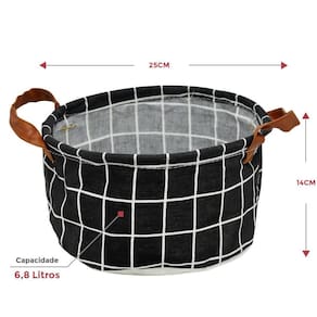 - Medidas: 25 x 14 diâmetro x altura - Alças laterais para puxar de couro sintético - Resistente a água e poeira - Dobrável - Ideal para organizar pequenos objetos, toalhas de rosto, meias e etc...
