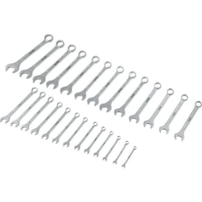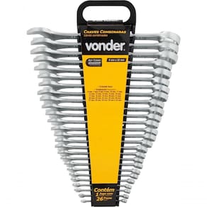 1 Jogo de chaves combinadass, composto por um suporte plástico com 26 peças, sendo: 6 mm, 7 mm, 8 mm, 9 mm, 10 mm, 11 mm, 12 mm, 13 mm, 14 mm, 15 mm, 16 mm, 17 mm, 18 mm, 19 mm, 20 mm, 21 mm, 22 mm, 23 mm, 24 mm, 25 mm, 26 mm, 27 mm, 28 mm, 29 mm, 30 mm e 32 mm.