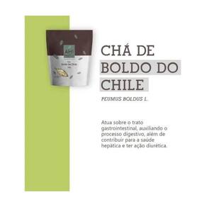 Cha de boldo do chile ahnatu 30g rendimento ate 10 xicara O chá de boldo do chile peumus boldus l. molina tem sua ação principal sobre o trato gastrointestinal, auxiliando no processo digestivo. Além disso, atua combatendo as dores na região abdominal e contribui com a saúde hepática. ====== Contraindicações: não deve ser em casos de gravidez e/ou lactação. ====== Modo de preparo: coloque 1 colher sopa de erva para cada litro de água. Adicione a água aquecida sobre a erva e deixe em infusão de 5 a 10 minutos. Então é só coar e beber. Se preferir tomar gelado, você pode adicionar pedras de gelo após o preparo. Nossos ingredientes passam por um processo de esterilização que garante a segurança e a pureza dos produtos. Rendimento: cada embalagem 30g rende aproximadamente 10 xícaras de chá