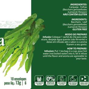 Chá de carqueja - 10 sachês - 13g Antioxidante e digestivo. Ingredientes: Carqueja - folhas baccharis genistelloides lamarck persoon .