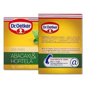 Ingredientes: Hortelã Mentha piperita L. - folhas e ramos, chá preto Camellia sinensis L. Kuntze - folhas e talos, abacaxi Bromelia ananas L. - infrutescência e aromatizante. Alérgicos: Pode conter trigo, centeio, cevada e aveia. Contém glúten. Conservação: Conservar em local fresco e seco, ao abrigo da luz. Validade: Vide data de validade na embalagem. Fabricante: Dr. Oetker.