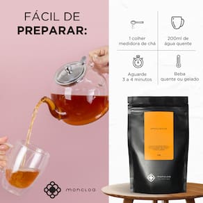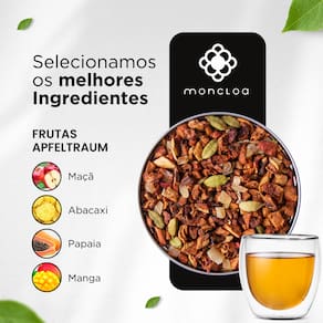 Chá misto de maçã, abacaxi, papaia e manga com gengibre e cardamomo. Sabor coco, canela e goiaba.