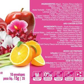 Chá misto de flores e frutas - 10 sachês - 15g Antioxidante. Ingredientes: Maçã - frutos pyrus malus l. ; hibisco - flores hibiscus sabdariffa l. ; beterraba - raízes beta vulgaris l. ; mate tostado - folhas e talos llex paraguariensis st. Hill. ; laranja-amarga - frutos citrus aurantium l. ; limão - frutos citrus limonium risso ; capim-cidreira - folhas cymbopogon citratus stapf ; chá preto - folhas e talos camellia sinensis l. kuntze ; aroma artificial de cereja e aroma artificial de framboesa. Não contém glúten.