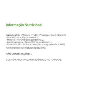 Chá misto de pêssego maçã mate tostado e laranja cx. Com 10 sachês 10 envelopes. Peso liquido: 10g maçã - frutos pyrus malus l. ; pêssego - frutos prunus persica l. batsch ; mate tostado - folhas e talos ilex paraguariensis st. Hil. ; laranja-amarga - frutos citrus aurantium l. ; aroma idêntico ao natural de pêssego. não contém glúten. Modo de preparo: coloque 1 sachê de chá para cada xícara, despeje água quente não fervente e deixe em infusão até o sabor e o aroma ficarem a seu gosto. - sem adição de açúcares. - zero calorias. - não contém glúten.