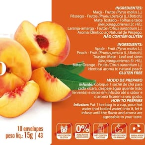 Chá misto de pêssego maçã mate tostado e laranja cx. Com 10 sachês 10 envelopes. Peso liquido: 10g maçã - frutos pyrus malus l. ; pêssego - frutos prunus persica l. batsch ; mate tostado - folhas e talos ilex paraguariensis st. Hil. ; laranja-amarga - frutos citrus aurantium l. ; aroma idêntico ao natural de pêssego. não contém glúten. Modo de preparo: coloque 1 sachê de chá para cada xícara, despeje água quente não fervente e deixe em infusão até o sabor e o aroma ficarem a seu gosto. - sem adição de açúcares. - zero calorias. - não contém glúten.