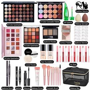 Kit Completo de Maquiagem All in One da CHAFFUL oferece tudo que você precisa para sua rotina diária de beleza: base, primer facial, paleta de sombras, paleta de contorno, paleta de corretivos, gloss labial, batom em gel, pó solto, pó para sobrancelha, esponjas, batons, delineador, estênceis para sobrancelha, rímel, conjunto de pincéis profissionais e uma prática bolsa para transporte. Ideal tanto para iniciantes quanto para entusiastas experientes, este kit atende perfeitamente todas as suas necessidades diárias de maquiagem.