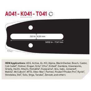 - Atualize sua motosserra com a combinação premium de barra e corrente do Oregon. Certifique-se de que sua serra use uma barra de 40,6 cm com corrente de serra de calibre 1,27 cm com 56 elos de acionamento e suporte de motor A041