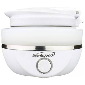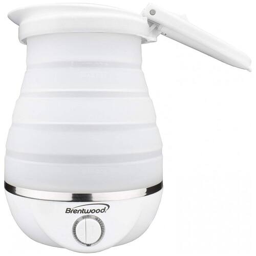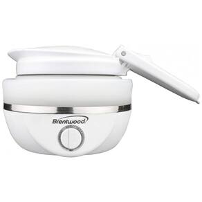 Chaleira elétrica Brentwood 0.8L, 1200W, corpo dobrável, elemento de aquecimento oculto, com desligamento automático, lâmpada piloto, porta-fio, e indicador de nível de água.Características