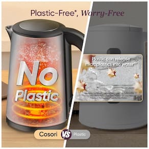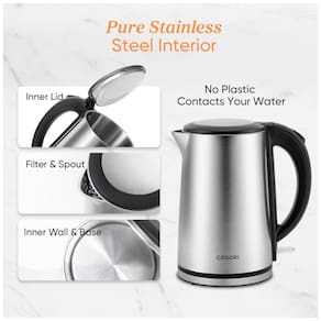 Chaleira elétrica com design de parede dupla em aço inoxidável, capacidade de 1.5L, desligamento automático e proteção contra fervura. Possui tampa com abertura em dois níveis (45º e 80º) e indicador LED azul de funcionamento.Acessórios