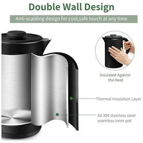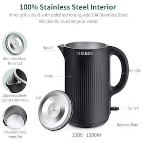 Chaleiras elétricas para ferver água, 1,7 litro, o sabor mais puro, sem contato de plástico com água quente vem com aço inoxidável 304 de qualidade alimentar sem risco de ferrugem na panela interna, tampa interna, bico e borda. Nenhum plástico em contato com água quente. Água potável segura e saudável Chaleira elétrica, aço inoxidável, construção de parede dupla Feito com construção de parede dupla, ferva a água mais rapidamente e use muito menos energia do que as chaleiras de fogão. Chaleira de água de aço inoxidável também mantém sua água quente por muito mais tempo e quente ao toque durante o aquecimento Chaleira de água quente elétrica, tecnologia segura e desligamento automático desligamento automático em 20 segundos após a fervura total da água. Recurso de segurança de ebulição onde desliga se detectar que não há água no interior, economia de energia e durabilidade Chaleira de aquecedor de água fácil de limpar uma caldeira de água quente de boca larga significa fácil limpeza e enchimento, permite fácil acesso para limpar esses depósitos ou ferrugem