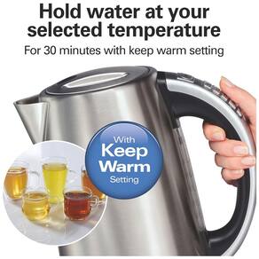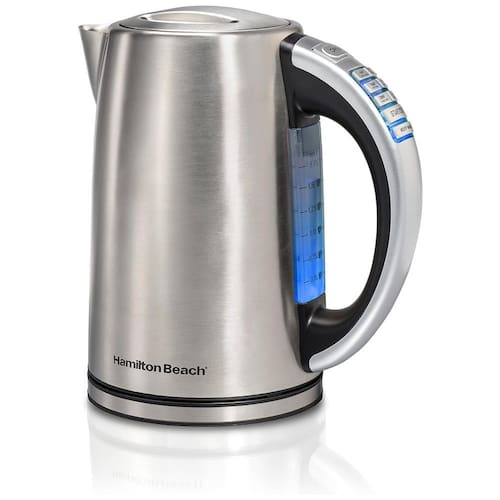 Cor Prata. 7 Litros Aço Inoxidável. Chocolate quente Sopa instantânea Se você gosta disso, a Hamilton Beach 1. Chaleira elétrica com controle de temperatura em aço inoxidável, caldeira de água e aquecedor de chá com indicador LED, mantenha a proteção quente, com desligamento automático e fervura a seco, em poucos minutos. O poderoso sistema de fervura rápida fornece aquecimento rápido a partir de qualquer tomada padrão e a função de desligamento automático ajuda a impedir que as chaleiras fiquem secas. As chaleiras da Hamilton Beach são ótimas e fáceis de usar. Além disso, a maioria das chaleiras inclui uma base rotativa ou sem fio de 360 graus para facilitar o serviço. As chaleiras de Hamilton Beach apresentam uma alça para manter a calma e um bico sem gotejamento que facilita o vazamento