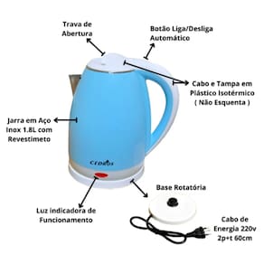 Características Gerais do produto Capacidade de 1.8L, Indicador Lumetrosinoso, Desligametrosento Autometrosático, Indicador de Nível de Água, Base semetros fio cometros rotação de 360º, Resistente ao calor e livre de substâncias tóxicas.