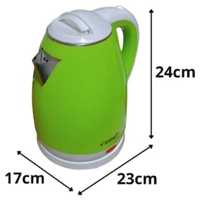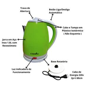 Capacidade de 1.8L, Indicador Luminoso, Desligamento Automático, Indicador de Nível de Água, Base sem fio com rotação de 360º, Corpo de aço inoxidável, Cabo em plástico isotérmico, Fervura rápida, Desligamento automático quando vazia, Econômico, conveniente e elegante aparência.Acessórios