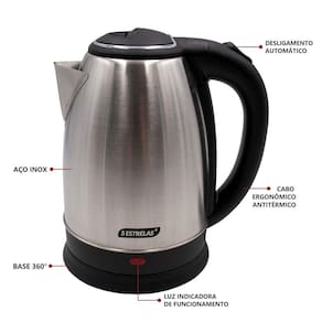Chaleira elétrica 1.8L em inox escovado, 127V, 1000W, com desligamento automático ao ferver.Características