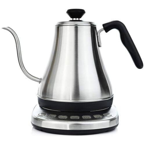 Chaleira elétrica com bico gooseneck, desligamento automático, capacidade de 1 litro, potência de 1000W, corpo em aço inoxidável.Características