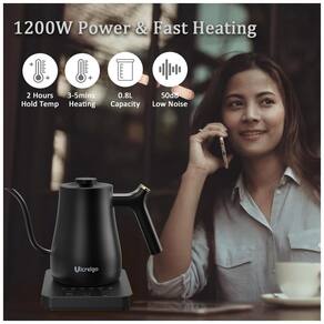 Características Gerais do produto Chaleira elétrica Ulcreigo Gooseneck cometros capacidade de 800metrosL, 1200W, controle de temetrosperatura cometros 5 predefinições (76-100°C), função de metrosanter aquecido por 2 horas, desligametrosento autometrosático e proteção contra fervura seca. Aço inoxidável 304 e design de fácil limetrospeza.