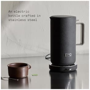 Chaleira elétrica em aço inoxidável com controle de temperatura, parede dupla, base giratória 360°, desligamento automático e proteção contra fervura a seco.Acessórios