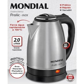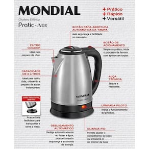 A Chaleira Elétrica Mondial conta com jarra sem fio, que facilita o manuseio do eletroportátil. Assim, você poderá levar a água quente até sua xícara de forma prática e sem sujeira. Possui também desligamento automático, o que garante um preparo seguro. E para completar: você pode utilizar a Chaleira Mondial para preparar café, chá, ferver água para macarrão, arroz ou qualquer outra receita.