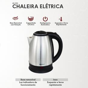 Chaleira elétrica com design em aço inoxidável, capacidade de 1,8 litros, desligamento automático ao atingir o ponto de fervura, base removível com rotação 360º e luz indicadora de funcionamento.Acessórios