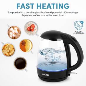 Desligamento AutomáticoChaleira elétrica de vidro AROMA® 1,2 L/5 xícaras com derramamento sem fio, tampa de liberação de gatilho, desligamento automático, preta (AWK-151B)