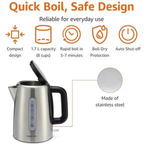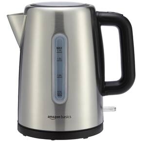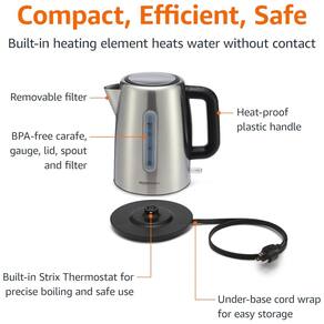 Chaleira elétrica de aço inoxidável de 1,7 litros , 1500 watts para ferver água rapidamente Faça chá de ervas, sopa instantânea, cacau, café francês e muito mais em uma fração do tempo Destaca se da base para servir sem fio conveniente com uma alça de plástico à prova de calor Design compacto com sistema de enrolamento de cabo prático para zenamento com economia de espaço Inclui filtro removível, janela de nível de água e elemento de aquecimento oculto Os recursos de segurança incluem desligamento automático e proteção contra fervura a seco feito com plástico sem BPA