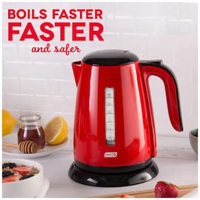 AQUECE MAIS RÁPIDO A tecnologia de fervura rápida aquece a água rapidamente e a capacidade máxima de 1.7L torna isso ótimo para porções individuais ou grandes reuniões de grupo chá, café, sopa, aveia, macarrão e muito mais MAIS A tampa de abertura suave permite que o vapor escape gradualmente, e a alça de toque frio e sem fio permite o transporte rápido e fácil da chaleira da cozinha para a mesa DESLIGAMENTO AUTOMÁTICO A proteção do botão de partida e fervura a seco desliga quando subenchido ou quase vazio torna esta chaleira seu acessório de cozinha GO TO é tão fácil que até seus filhos podem usá lo PRESENTE PERFEITO O casamento perfeito ou um presente para casa Seu tamanho pequeno ocupa pouco espaço no balcão, e seu design elegante e opções de cores modernas combinam com qualquer decoração de cozinha adicione ao seu registro agora INCLUI Apoiado por uma garantia do fabricante de 1 ano, o Dash Easy Kettle de 1500 watts inclui pés antiderrapantes, livro de receitas e acesso ao banco de dados de receitas todas as peças não elétricas são facilmente limpas