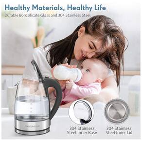 Chaleira elétrica de vidro com capacidade de 1.8L, 1500W, luz LED azul, desligamento automático, proteção contra queima a seco, base em aço inoxidável 304 e design durável.Características