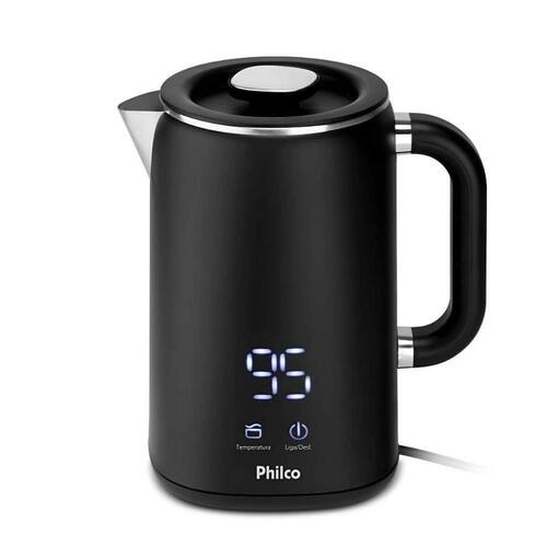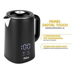 Chaleira Elétrica Digital Philco PCH18B com capacidade de 1,8 litros. Possui display digital, controle de temperatura ajustável de 45°C a 85°C, tecnologia Maxx Heat para manter a água aquecida por até 4 horas, acabamento interno duplo para reduzir a temperatura externa, jarra sem fio com base giratória 360°, e tecnologia Boil Dry para evitar funcionamento sem água.Acessórios