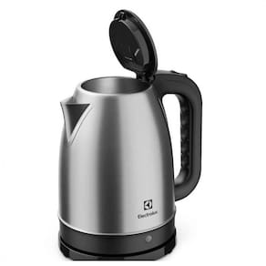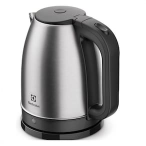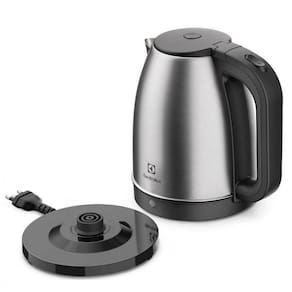 Chaleira Elétrica Eletrolux com capacidade de 1,8 litros, acabamento em aço inoxidável escovado e desligamento automático ao atingir 100°C.Características
