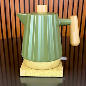Chaleira Elétrica Em Porcelana Elegance Verde 1,2L 127V com design moderno e detalhes amadeirados, ideal para aquecer água para chá, café e outras infusões.Características