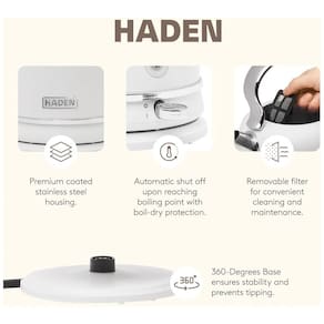 A chaleira elétrica Haden Chelsea Ivory & Chrome modelo 75160 foi desenvolvida para aquecimento de até 1,7 litro de água em uso doméstico, atendendo preparo de chá, café e outras bebidas quentes. A estrutura em aço inoxidável com acabamento esmaltado na cor marfim e detalhes cromados integra base com conexão 360°, permitindo posicionar a chaleira em qualquer orientação.