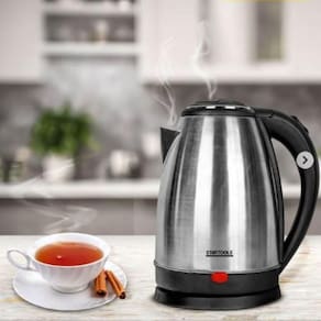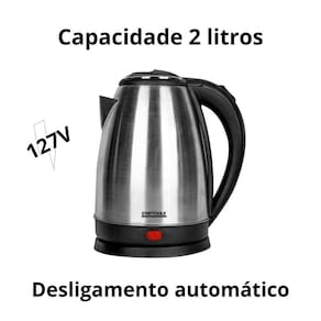 Chaleira elétrica em inox com capacidade de 2 litros, potência de 1000W, desligamento automático e proteção contra funcionamento a seco.Características