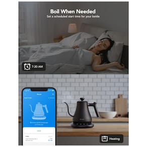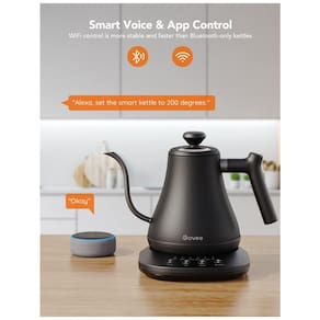 Chaleira elétrica inteligente Govee com controle via app e voz (Alexa), capacidade de 0.8L, potência de 1200W, controle de temperatura preciso (40°C a 100°C), função Rapid Boil, desligamento automático e corpo em aço inoxidável.Características