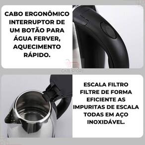 Chaleira eletrica jarra elétrica 110v aquecedor rápido água Excelente chaleira jarra eletrica para esquentar sua água, seu café, preparar seu chá ou até mesmo seu chimarrão ou chocolate quente. Sua alta potência de 1.500w faz com que o líquido ferva rapidamente em questões de minutos. Ganhe tempo e tenha mais praticidade que está linda jarra elétrica de inox com capacidade de até 2 litros.
